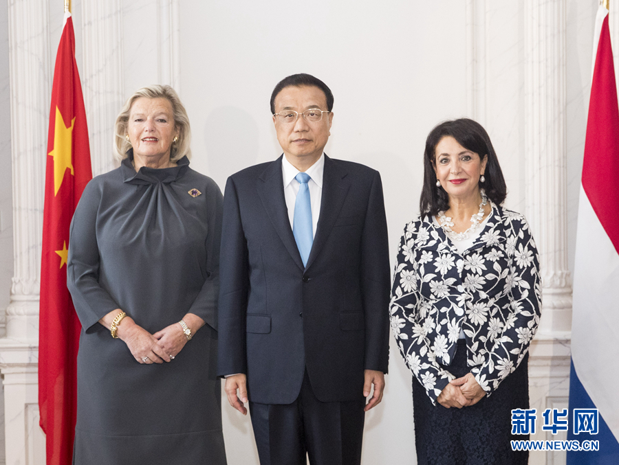 当地时间10月16日上午,国务院总理李克强在荷兰议会大厦会见荷兰议会两院议长安吉·布鲁克斯—克诺尔和哈蒂亚·阿瑞布。