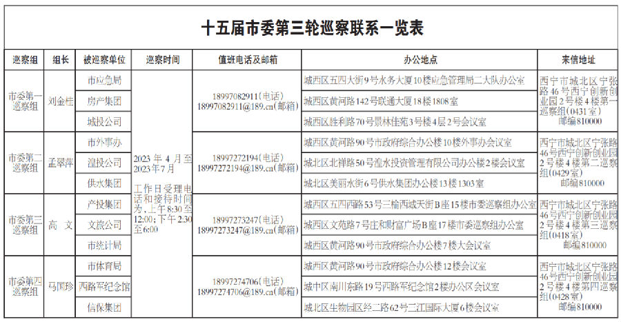近日,市委4个巡察组先后进驻市应急局、市外事办、市统计局、市体育局、西路军纪念馆、城投公司、产投集团、供水集团、房产集团、湟投公司、文旅公司、信保集团开展工作。