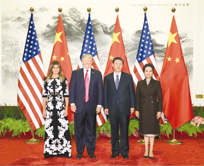 11月9日,国家主席习近平在北京人民大会堂东门外广场举行欢迎仪式,欢迎美利坚合众国总统唐纳德·特朗普对中国进行国事访问。这是习近平和夫人彭丽媛在人民大会堂同特朗普夫妇合影。