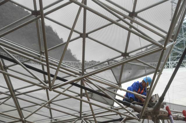 △工人正在安装FAST的反射面板,具有透光透水的特性