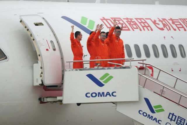 △C919客机完成首飞,在上海浦东国际机场着陆后,首飞机组人员走出机舱向观礼嘉宾挥手致意。