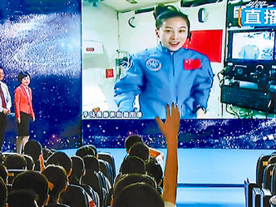 △2013年6月20日 王亚平在进行太空授课时和地面课堂的学生互动