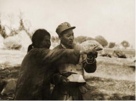 △山东当地一位大娘冒着危险为我军炮兵指挥员指示炮击目标。(孟良崮战役纪念馆供图)