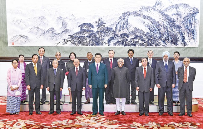 习近平与缅甸总统吴登盛、印度副总统安萨里共同会见出席大会的中缅印三国部分代表