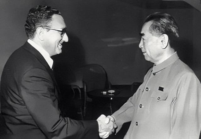 时任外交部翻译 冀朝铸:总理前面除了几张白纸以外什么都没有,这个时候基辛格博士十分谨慎地打开了他面前厚厚的一本材料汇编,就开始念起来了。开始的时候他非常拘谨,也不看谁,就是照本宣读,他用英文说:I am very much honour to be here today in the mysterious land……总理微笑着马上打断了基辛格的话,就对基辛格说,博士,你会很快地了解到,我们并不是一个神秘的国土。然后基辛格微笑了一下,他就把那个本关起来,推到一边,然后双方就开始正式谈起来。