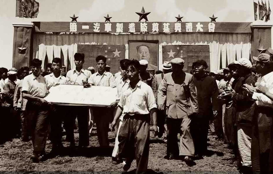 纪录片《第一辆汽车》:建设者们在这里宣誓,他们将在三年中,完成这光荣的使命,在这块基石上刻着我们的毛主席的题字“第一汽车制造厂奠基纪念”。