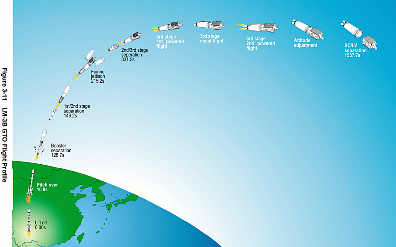 新闻播报:这次发射是长征系列运载火箭第53次发射。火箭飞行1495秒后星箭分离,20分钟后,西安卫星测控中心传来数据表明,卫星已按发射服务合同规定的入轨要求,顺利地进入了近地点高度600公里、远地点高度35946公里、倾角为19度的地球同步转移轨道。