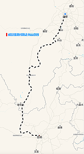 △成昆铁路,起于四川省成都市,止于云南省昆明市