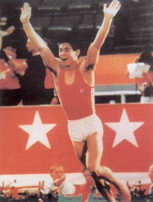 △“体操王子”李宁在第23届奥运会自由体操比赛中获得满分
