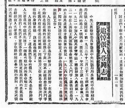 △1933年1月7日,《红色中华》登载《追悼张人亚同志》。
