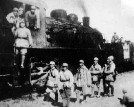 △铁道游击队沙沟受降仪式后,队员们在火车前的合照