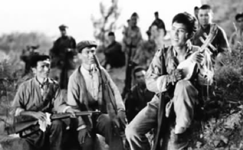△电影《铁道游击队》中游击队员们在战斗之余休息歌唱的场景